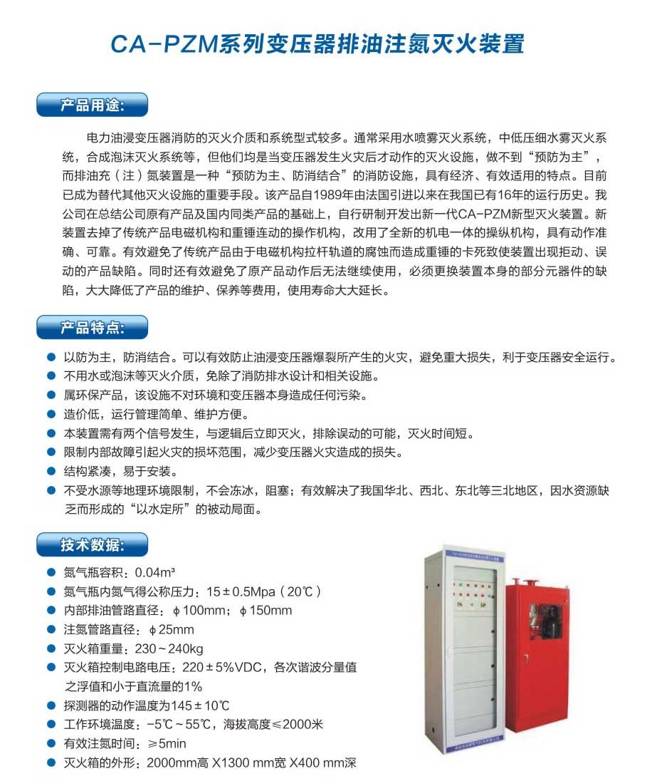 • 電力油浸變壓器消防的滅火介質和系統型式較多。通常采用水噴霧滅火系統,中低壓細水霧滅火系統,合成泡沫滅火系統等,但他們均是當變壓器發生火災后才動作的滅火設施,做不到“預防為主” , 而排油充(注)氮裝置是一種“預防為主、防消結合”的消防設施,具有經濟、有效適用的特點。目前已成為替代其他滅火設施的重要手段。該產品自, 989 年由法國引進以來在我國已有 16 年的運行歷史。...