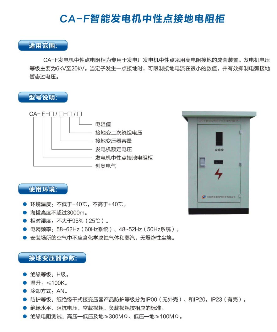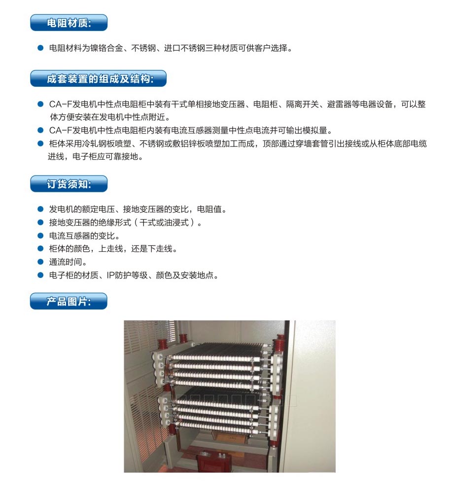 • CA-F發電機中性點電阻柜為專用于發電廠發電機中性點采用高電阻接地的成套裝置。發電機電壓 等級主要為6kV至20kV。當定子發生一點接地時,可限制接地電流在很小的數值,并有效抑制電弧接地 暫態過電壓。...