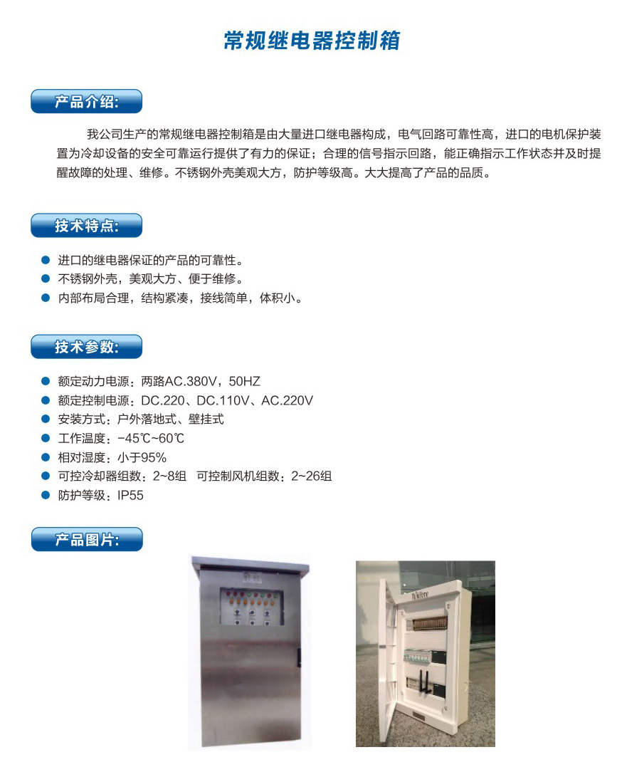 • 我公司生產的常規繼電器控制箱是由大量進口繼電器構成,電氣回路可靠性高,進口的電機保護裝 置為冷卻設備的安全可靠運行提供了有力的保證;合理的信號指示回路,能正確指示工作狀態并及時提 醒故障的處理、維修。不銹鋼外殼美觀大方,防護等級高。大大提高了產品的品質。...